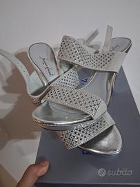 vendo vestito taglia L tutto cucito a mano in vero pizzo, +stola+scarpe color argento numero 40,usato solo un paio di ore