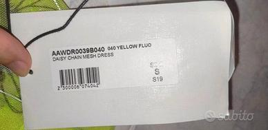 Colore giallo fluo, con motivi di margherite e stampa in rilievo del brand