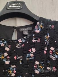 vestito bambina medio corto,con fantasia floreale ,maniche corte e gonna svasata, tessuto con lavorazione a rete
