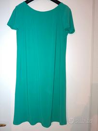 Vestito in 71% viscosa, 26% poliestere e 3% elastan. Marca Philly Firenze, taglia 46, collo rotondo davanti e a V con pieghe dietro, manica corta, colore verde. Usato poco
