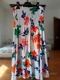 Vestitino estivo con vivace fantasia floreale multicolor su fondo bianco.