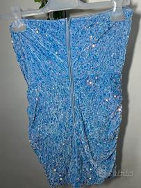 Abito tubino corto color azzurro cielo, interamente ricoperto di paillettes che riflettono la luce con eleganza. Modello aderente, con drappeggio frontale e zip posteriore invisibile. Foderato internamente per garantire comfort e vestibilità. Un capo perfetto per cerimonie, feste o serate speciali.
