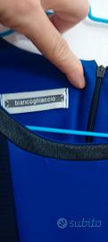 vestito invernale smanicato blu con inserti in ecopelle neri. leggermente elasticizzato. taglia 46. marca biancoghiaccio.