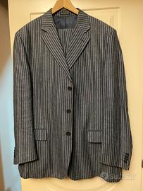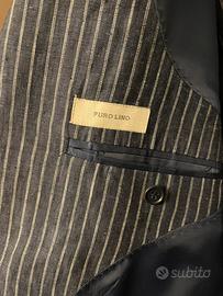 Vestito puro lino colore blu marine a piccole righe beige modello tre bottoni