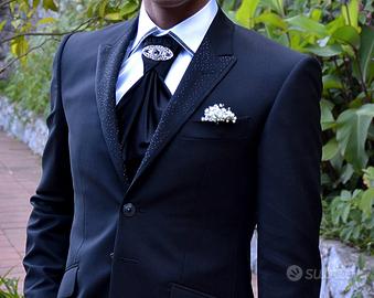 il vestito è composto da: giacca ove sono presenti swarovski neri, gilet, pantaloni, plastron cravatta.