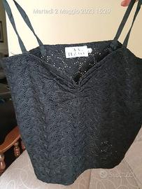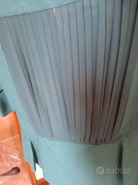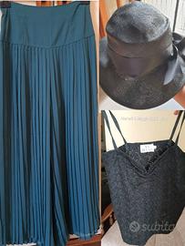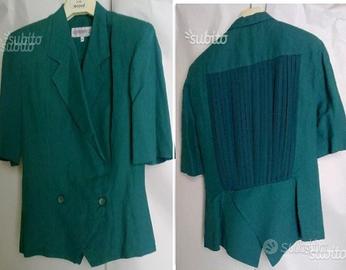CERIMONIA TG. 44 Colore verde petrolio in puro lino. GIACCA doppio petto con manica corta. Misura spalle cm 44, L. cm 62: Sul retro è interamente plissettato. PANTALONE plissettato, L. cm 93 (con sotto-pantalone di stoffa, no trasparente ). Corpetto in macramè, color nero con spalline. Cappello elegante in tela nero, con nastro di raso in tinta, indossato solo una volta per cerimonia Firmato Iliana Ghinelli Made in Italy