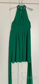 Abito verde smeraldo, senza maniche, caratterizzato da uno scollo all'americana con dettagli decorativi in perline e strass lungo il colletto. Il colletto si chiude con due bottoni gioiello! Ha una fascia in vita che valorizza la figura. Ci sono due lembi di tessuto che si possono annodare per creare un fiocco.