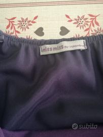 Vestito viola, effetto raso, doppia gonna, decoltè plissettato, indossato una volta, come nuovo, Miss Miss by Valentina, taglia M, con nastro da legare a piacere, sul davanti o sul retro
