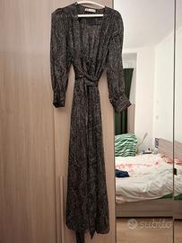 Io sono alta 172 e arriva giusto ad piedi. Lo spacco é di lato. Taglia L quindi 44/46 italiana, ma è regolabile ( io sono una 42).