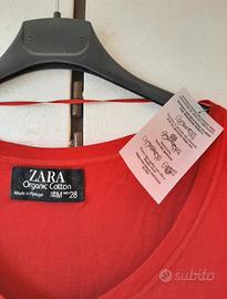 Vestito rosso in cotone organico di Zara. La gonna inizia poco sotto il seno per cui è adatto anche come vestito premaman. Vista la comoda vestibilità è adatto per chi porta una taglia M/L.