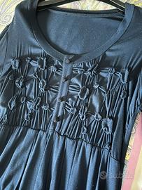 Vendo vestito Nuovo a manica lunga con taglio a impero color blu scuro impreziosito sul davanti. Taglia 46-48. Mai usato, mai indossato.