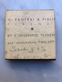 Vendo scatola originale per quadrante orologio Panerai "Luminor" degli anni 50. Solo scatola, no quadrante. Scatola da collezione con al suo interno n. 1 vetro originale in plexiglas per orologio Panerai Ref. 6152/1 movimento Rolex. Il vetro è un fondo di magazzino, misura diametro 40.79mm (visibile in foto). Prezzo trattabile.