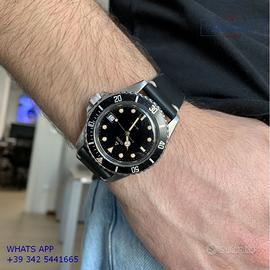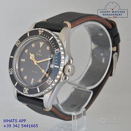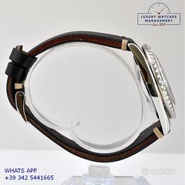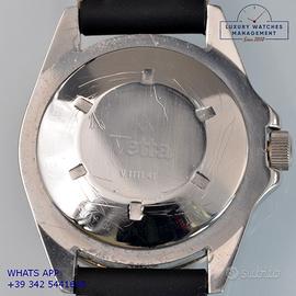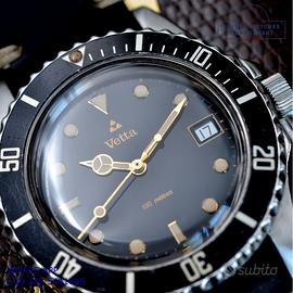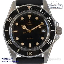 Vetta Diver Submariner prototipo acciaio, anno produzione 1980 circa, ghiera bidirezionale acciaio, vetro plastica bombato, quadrante lucido colore nero con data grafica oro e sfere Mercedes dorate, movimento meccanico a carica automatica, cinturino vintage in pelle vacchetta color nero con fibbia acciaio generica.