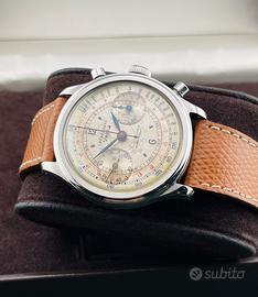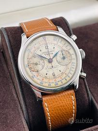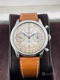 Stupendo e raro Vetta Cronografo Antimagnetique Impermeabile “Ermetico” con cassa in acciaio da 38mm, quadrante argentè virato all’avorio, sfere ore e minuti a foglia, numeri arabi a ore 12 e a ore 6, doppia scala periferica tachimetrica in base 1000 blu e telemetrica rossa, fondello avvitato e serrato da 4 viti, corona impermeabile e pulsanti a pompa, vetro plastica.