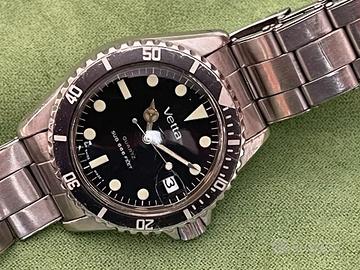 Vendo splendido orologio subacqueo Vetta Submarine al quarzo, anni ’60, in ottime condizioni generali e perfettamente funzionante. Modello professionale da immersione, resistente fino a 666 piedi (200 metri).