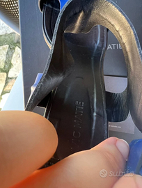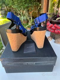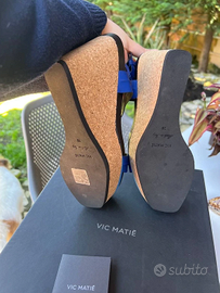 Sandali dal design t-strap estremamente donanti e slancianti. Il contrasto cromatico tra le zeppe in sughero, la tomaia blu, e la suola nera le rendono audaci e perfette per le frizzanti serate estive ma anche per look giornalieri. L'altezza del tacco non preclude la comodità di una scarpa il cui brand è tra i più blasonati nel panorama del Made in Italy