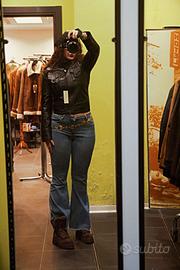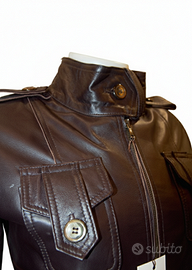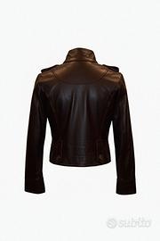 Giacca originale Vincent, storica manifattura di Ariano Irpino attiva dal 1972. Un capo che esprime il carattere della vera artigianalità italiana, combinando un design deciso a una qualità costruttiva d'eccellenza. Descrizione del Capo Realizzata interamente in vera pelle di alta qualità, con una finitura liscia e una mano morbida ma strutturata. Il capo è nuovo, mai indossato, completo di cartellino originale ben visibile. Il colore è un Marrone Bruciato Intenso, una tonalità calda che vira verso il cioccolato fondente con lievi riflessi mogano/prugna a seconda della luce. È una sfumatura sofisticata, molto più rara e distintiva rispetto al comune marrone scuro. Design e Caratteristiche Tecniche Il design si ispira allo stile biker/military chic, ricco di dettagli funzionali ed estetici: Collo: Alto a listino, richiudibile con cinturino in pelle e bottone metallico logato. Spalline: Presenza di mostrine sulle spalle con chiusura a bottone, tipiche del taglio militare. Tasche: Due taschini superiori applicati sul petto con pattina e bottoni metallici a contrasto (color oro invecchiato). Due tasche inferiori a filo con chiusura a zip metallica orizzontale. Chiusura: Frontale completa con robusta zip metallica. Maniche: Polsini alti rifiniti con cuciture sartoriali e taglio ergonomico. Dettagli Brand: Vincent Origine: Italia (Ariano Irpino) Materiale: 100% Vera Pelle Colore: Marrone Bruciato / Mogano Condizione: Nuovo con cartellino Vestibilità: Slim/Short (taglio corto in vita) *DISPONIBILI PIU' TAGLIE** Nota: Un pezzo distintivo e autentico, perfetto per chi cerca un colore originale e la garanzia della storica tradizione manifatturiera di Ariano Irpino.