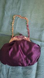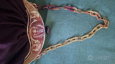 Borsa Vintage originale, chiusura in celluloide / galalite decorata motivo egizio (sfinge + figure) → stile Egyptian Revival catena in plastica/materico tipico anni ’20–’30 tessuto seta/satin