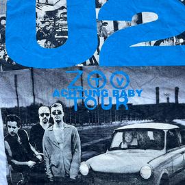 Grafica pazzesca con collage fotografico dei membri della band + logo U2 frontale e back print iconico con auto Trabant blu, simbolo dell’era Achtung Baby.