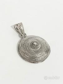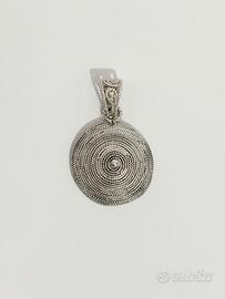 Pendente in Filigrana e Perla d'Argento anni '60 Lavorato a mano. Diametro di circa 27 mm La forma di cesto a spirale è una dedica alla figura femminile che contiene e genera la vita, protegge e nutre, è un simbolo di buon augurio, un richiamo alla prosperità.