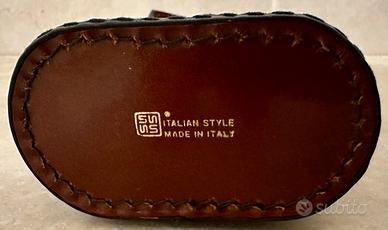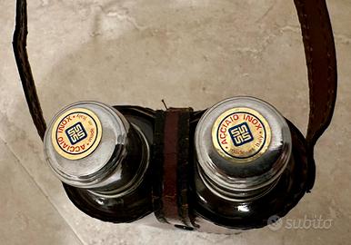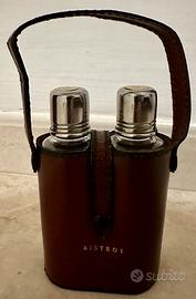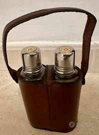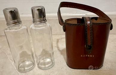 Vintage set beauty in pelle composto da due bottiglie in vetro con tappo in acciaio inox. Le bottiglie sono contenute in un contenitore in pelle vintage realizzato a mano. Il set e' marchiato luxury in leather italian style. Si trova in ottimo stato con qualche segno dovuti al tempo. Le bottiglie hanno altezza con tappo 13,5 cm e diametro 4 cm (circa 100 ml). Sarà accuratamente imballato e spedito.
