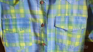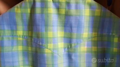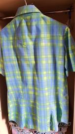 Fresca e allegra camicia in cotone taglia 40, modello sciancrato, carré posteriore, taschine anteriori , vivace incrocio di colore verde acido e azzurro, ottimo stato, originale produzione di Livio de Simone, Capri.