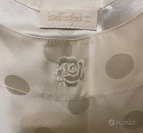 Elegante camicia da notte originale Malizia lingerie anni ’80, in pura seta naturale, nuova e mai indossata, ancora nella sua scatola originale. Modello lungo in seta jacquard a pois tono su tono, con piccole rose ricamate su scollo e spalline e 4 bottoncini originali in madreperla. Taglia III (vestibilità M/L delle linee di lingerie dell’epoca). Proviene dalla mia famiglia a Trieste, conservato con cura. Parte tecnica: – Marca: Malizia lingerie – Anni: 1980 ca. – Taglia: III – Materiale: 100% seta – Colore: panna jacquard a pois – Dettagli: ricami a rosa + 4 bottoni madreperla – Condizioni: nuova, mai usata – Peso: 140 g – Scatola originale inclusa