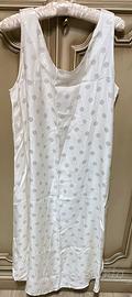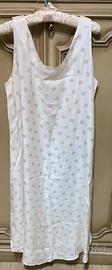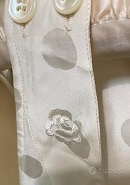 Elegante camicia da notte originale Malizia lingerie anni ’80, in pura seta naturale, nuova e mai indossata, ancora nella sua scatola originale. Modello lungo in seta jacquard a pois tono su tono, con piccole rose ricamate su scollo e spalline e 4 bottoncini originali in madreperla.