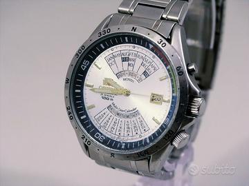 interessante orologio vintage Orient automatico Muli-Year e calendario water resistant 10at (100mt) all stainless steel cinturino originale compreso presumibilmente databile anni 80 cassa acciaio da 46mm (compreso proteggi corona) funzionamento in scala 60div con corona a 4h vetro minerale corona a vite chiusura fondello a vite quadrante argento 21 gioielli Japan BK EU03-00 in metallo smaltato logo e indici applicati sfere luminose al trizio ottimo il movimento automatico Orient 46d40 21 rubini senza carica manuale massa oscillante con cuscinetti a sfera quik set con il pulsante a 2h (tuttavia il disco del calendario puo essere stato aggiornato "upgrade" per gli anni successivi essendo l'orologio "un classico") per impostare il calendario protezione movimento contro gli urti Seiko-Diashock.L'orologio è usato ma egregiamente funzionante con osservazione sulle 24h e anche le parti in acciaio sono ottime solo il vetro tuttavia presenta qualche graffio non essendo stato sostituito volutamente per mantenere full original