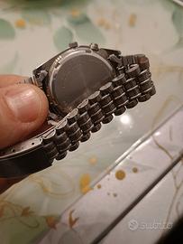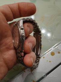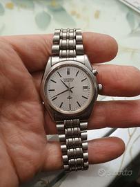 L'orologio mostrato è un modello vintage Seiko Kinetic, identificato principalmente come parte della serie 5M42 (nello specifico il modello 5M42-0B80).Caratteristiche principaliMovimento: Si tratta di un sistema Kinetic, una tecnologia ibrida di Seiko che genera energia elettrica dal movimento del polso per alimentare un meccanismo al quarzo.Design: Presenta una cassa in acciaio inossidabile da circa 36-37 mm, un quadrante bianco o grigio chiaro con indici a bastone e una finestrella per la data a ore 3.Pulsante supplementare: Il pulsante situato a ore 2 serve solitamente come indicatore della riserva di carica; premendolo, la lancetta dei secondi scatta in avanti per indicare quanta energia è rimasta accumulata nel condensatore.Periodo: Questi modelli risalgono prevalentemente agli anni '90.