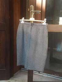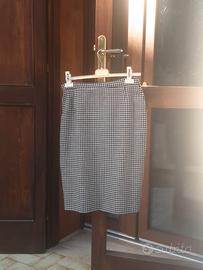 Elegante completo da donna in stile tweed, caratterizzato dall'intramontabile motivo pied-de-poule in bianco e blu. Questo set di due è composto da una giacca corta (cropped) e una gonna coordinata. La giacca presenta uno scollo rotondo senza colletto, maniche lunghe e una chiusura frontale con bottoni dorati. È rifinita con bordi blu a contrasto lungo l'apertura, il collo, i polsini e le finte tasche sul petto, dettaglio raffinato che richiama uno stile sartoriale. La gonna a tubino riprende lo stesso motivo e tessuto della giacca per un look uniforme e raffinato. Il tessuto in misto lana, ideale per la primavera I bottoni dorati danno un tocco più “luxury”, spesso associato a capi ispirati all’alta moda. Acquistato nel 1992, lo indossare volentieri se non fossi cresciuta di 12 taglie. Spedizione a carico dell'acquirente