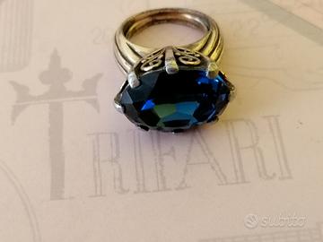 Anello Trifari, di foggia rinascimentale, metallo dorato lavorato, sormontato da un importante cristallo zaffiro sfaccettato. Di grande effetto, va bene per un dito sottile, non oltre la misura 13