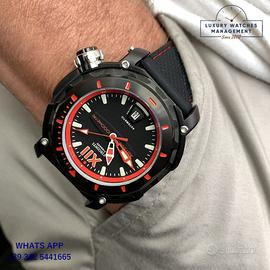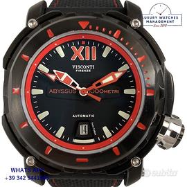 Visconti Abyssus 1000MT Full Dive acciaio con trattamento PVD colore nero, anno di produzione 2018, ghiera acciaio unidirezionale con trattamento PVD colore nero, vetro zaffiro antiriflesso, quadrante colore nero con data, indici e sfere al LumiNova, movimento meccanico a carica automatica, cinturino in gomma colore nero con fibbia acciaio Originale Visconti, più altro cinturino in pelle di alligatore colore rosso con fibbia acciaio Originale Visconti.