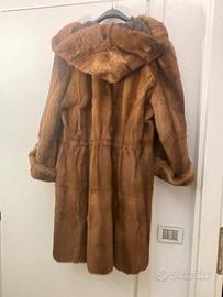 Elegante cappotto in visone femmina naturale color marrone caldo (tonalità ranch/demi-buff), linea femminile e leggera, con cappuccio integrato e raffinata fodera damascata. Vestibilita morbida, con delicata arricciatura posteriore , che valorizza la silhouette