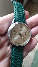 Wakmann (marchio distributore americano Breitling anni 40 a 70) cronografo meccanico tutto originale. Un vero pezzo da collezione. Raro da trovare soprattutto in queste condizioni generali . (Vendo solo per sfoltimento collezione) Il diametro è 35 mm esclusa la corona e 43 mm alle anse. La cassa in acciaio (ottime condizioni), Il vetro in plex è nuovo. Il quadrante è in ottimo stato, solo leggerissime macchioline di patina periferiche. La meccanica è carica manuale, venus 188, ponte marcato, con funzione cronografo, tutto funzionante e originale, tiene bene il tempo. Il fondello è in acciaio cromato e tutto marcato. Da vicino è uno spettacolo. Ha un cinturino verde coccodrillato in pelle nuovo di marca Morellato con fibbia cromata come la cassa.
