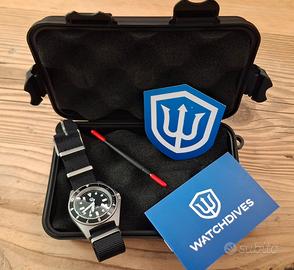 Cedo da collezione privata orologio militare Watchdives WD1972 con movimento al quarzo Seiko VH31 unico nel suo genere, celebre per la sua lancetta dei secondi "a scorrimento continuo" (sweep second). Vetro zaffiro, impermeabile 20bar, cassa in acciaio sabbiato. Stile Benrus. Fornito con comodo cinturino NATO originale e mai utilizzato. FULL SET. Orologio usato pochissimo e tenuto con cura.