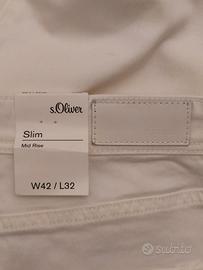 White jeans fashion da donna in misto cotone stretch (cotone 50% viscosa 40% poliestere 08% elastan 02%) il modello di tendenza a gamba dritta 5 tasche con la chiusura a zip taglia 46. Lunghezza 105 cm. giro vita 93 cm. larghezza fianchi 52 cm. larghezza caviglia 19 cm. Nuovo originale ed autentico - S.Oliver