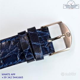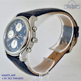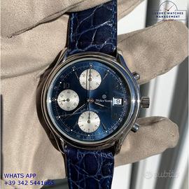 Vetta Etanche cronografo acciaio, anno produzione 1990 circa, vetro minerale bombato, quadrante soleil colore blue a tre contatori verticali colore bianco, indici arabi e sfere al trizio, movimento meccanico a carica automatica, cinturino in alligatore colore blu con fibbia acciaio originale Wyler Vetta, più altro cinturino in alligatore colore marrone.
