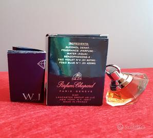 Elegante miniatura da donna di WISH CHOPARD con boccetta a forma di diamante. Originale. Mai aperta. Da collezione. È un profumo facente parte della mia collezione da molto tempo, consiglio di tenere solo per esposizione perché con il tempo la fragranza potrebbe essere alterata. Il profumo è abbinato ad un elegante portagioie in stoffa blu con specchietto
