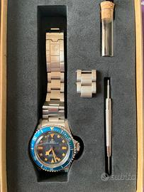 Vendo stupendo WMT Royal Marine Ocean Blue, diver 100mt. Homage del Tudor Sub Snowflake in edizione limitata di 100 pezzi. Acquistato nel Marzo 2025, box and papers presenti così come tutte le maglie aggiuntive. Dial, hands e bezel invecchiati ad arte dalla WMT. Clasp e corona logate WMT. Condizioni pari al nuovo. Monta Miyota serie 8 con ghost date e modifica Hacking seconds fatta da WMT su mia richiesta. Cassa con fori. Bezel bidirezionale. Vetro acrilico bombato. Orologi con queste caratteristiche non ne fanno più, il vintage ha prezzi inavvicinabili con rischi di parti non coeve. Ottimo per assaporare il feeling di uno dei diver che ha fatto la storia. Preferisco lo scambio a mano su Monza e Brianza così da conoscere altri appassionati, non sono interessato a permute o scambi. #tudor #snowflakes #homage #divers #vintagewatches #wmt #homagewatches #submariner #vintagediverwatch