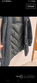 Woolrich originale, giaccone imbottito blu, modello Arctic Parka, leggermente avvitato. Tessuto Ramar antivento e idrorepellente. Cappuccio rimovibile. Taglia XS, vestibilità 40 italiana, linea slim fit adatta ad una silhouette esile. Misure: lunghezza cm 76; spalle cm 38; da ascella ad ascella cm 46; girovita cm 43; maniche cm 64. Indossato pochissimo, condizioni ottime.