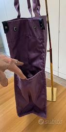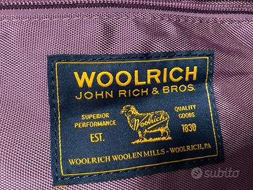 Borsa colore viola di tessuto in poliestere con bordi in alto agli angoli in pelle, con grande scritta WOOLRICH ricamata davanti.