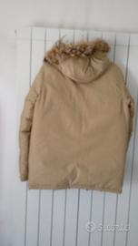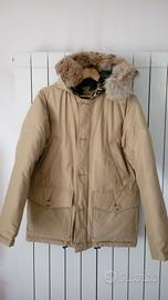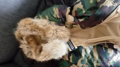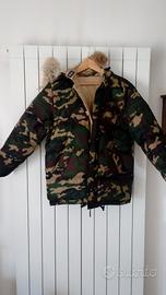 giubbotto invernale double face beige e verde camouflage reversibile con cappuccio con bordo in pelliccia