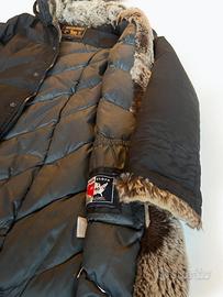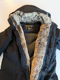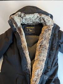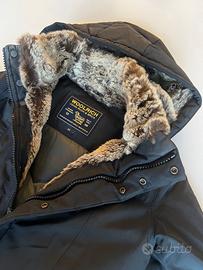 Woolrich Cappotto Boulder con inserto in pelliccia coniglio- colore nero taglia xs. Ottimo stato. Imbottito in piuma d'anatra, in tessuto Ramar Cloth, idrorepellente, barriera contro il freddo e la pioggia .Inserti in pelliccia sul cappuccio e lungo , chiusura con zip e bottoni a pressione nascosti, tasche laterali a filetto.