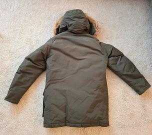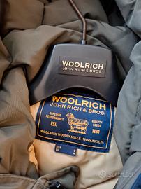 Parka Arctic Woolrich color verde militare. Presenta un cappuccio con pelliccia sintetica. Imbottito in calda piuma d'anatra, è realizzato in Ramar Cloth, un tessuto idrorepellente e resistente al vento. Quattro tasche frontali e chiusura con bottoni e zip.
