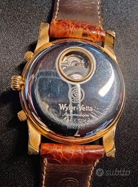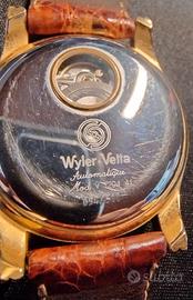 Per collezionisti vendo cronografo Wyler Vetta anni '90, automatico con calendario completo Ref. V1204 41, con cassa 36 mm, laminato oro, fondello con oblò a vista sul movimento, prodotto in 500 pezzi. Quello in mio possesso è il numero 054. Il movimento automatico è un ETA Valijoux 7750, tutto originale compreso il cinturino e la fibia.