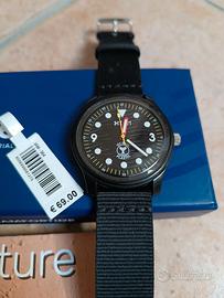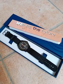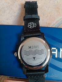Orologio particolare indossato raramente "I AM", che fa parte di un progetto di salvaguardia del pianeta. Cassa in plastica riciclata 40 mm, vetro della cassa in acrilico. Quadrante con indici e numeri luminous lavorato sul fondo con motivi ad onda. Fondello in acciaio. La chiusura è a fibbia in acciaio e può essere regolata facilmente in modo da adattare la grandezza dell’orologio a qualsiasi polso. Movimento PC21. Water resistant 5 atm. Cinturino realizzato con plastica riciclata.