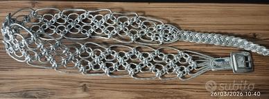 Cintura intrecciata color argento firmata Yamamay. La maglia metallica lucida crea un effetto "gioiello", ideale per arricchire outfit sia eleganti che casual. La cintura è realizzata in semipelle Nickel Free per evitare irritazioni. Cm 100. Cintura mai indossata.
