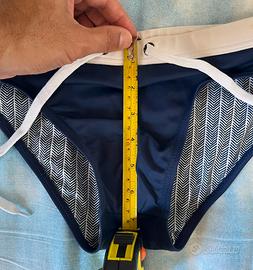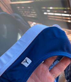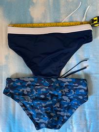 Colori: bianco e blu; il secondo costume presenta una fantasia con colori predominanti blu e derivati. Taglia S. Presenti gli elastici per stringere o allargare. Misure: larghezza 33,5cm. Lunghezza cavallo 18 cm.