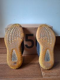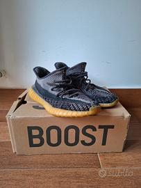 Yeezy Boost 350 v2 Carbon. La suola è un po' consumata. Come si vede in foto, la sinistra presenta una piccola scucitura, la destra un po' di più. Rimangono comunque utilizzabili e comode per passeggiare